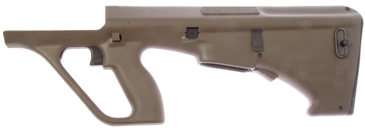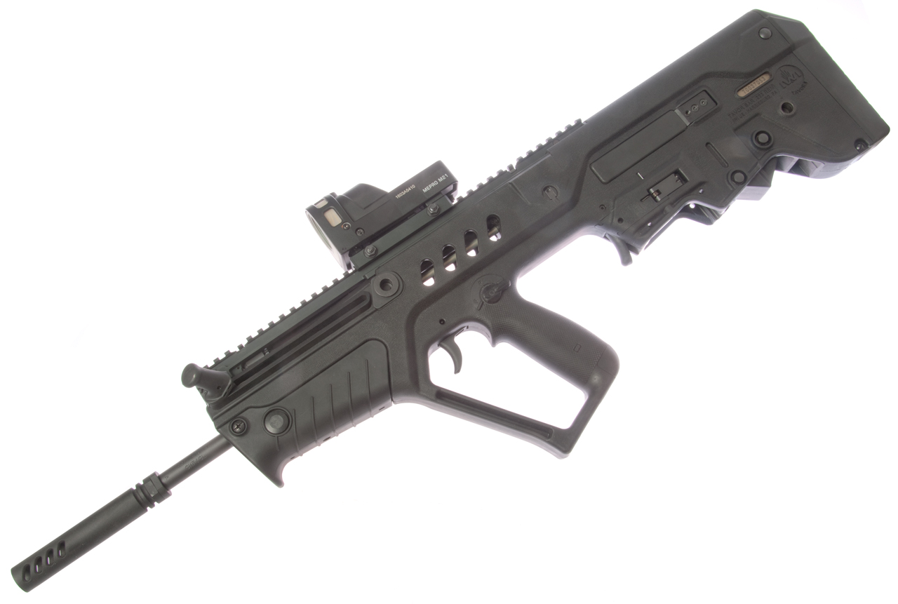 Made in Pennsylvania rather than Israel because of gun laws. Made to be semi-automatic. 0.223 caliber. Bull-pup (Wiki) design.