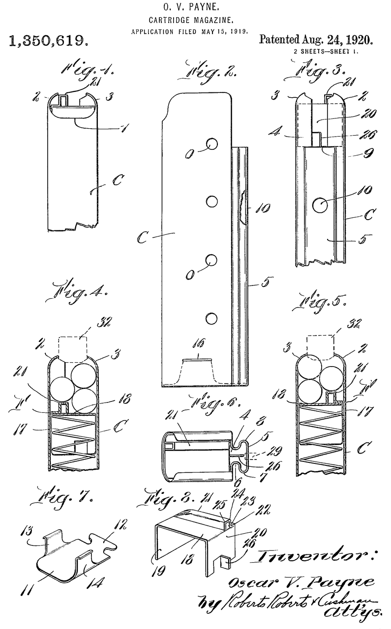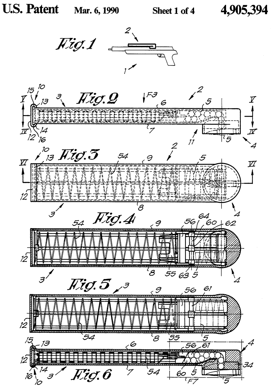 2903809 Cartridge magazine of aluminum or magnesium, Eugene M Stoner, Fairchild Engine and Airplane Corp (Wiki: ArmaLite), App:1956-02-21, Pub: 1959-09-15, - lighter weight than prior art steel magazines.