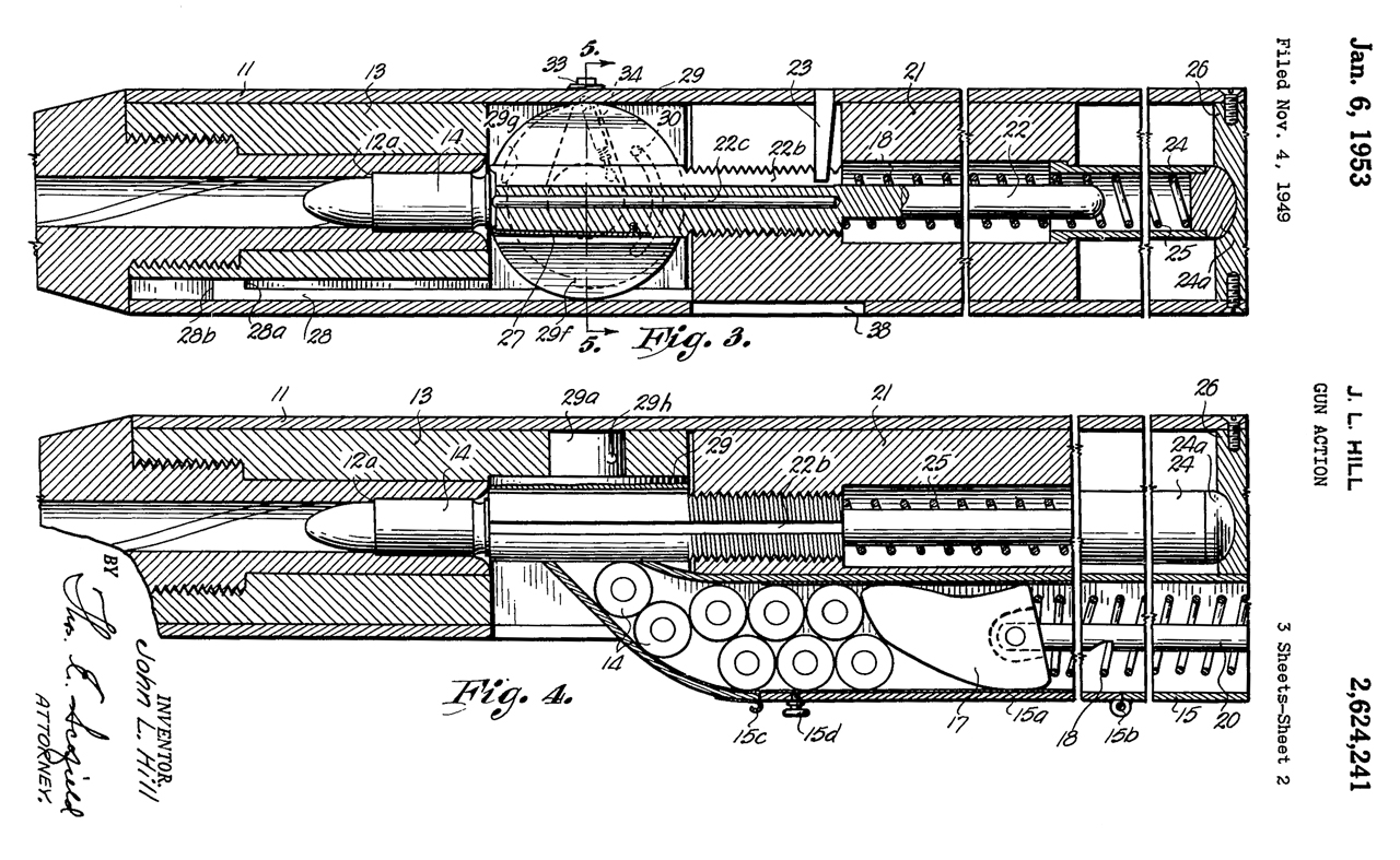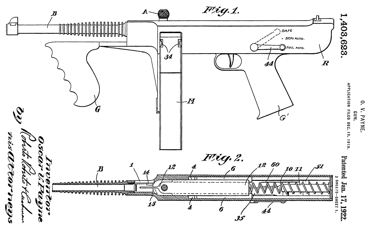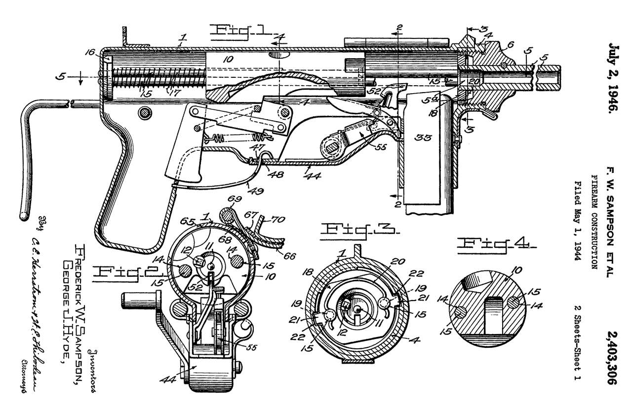 2426563 Recoil mechanism for automatic firearms, William Patchett George, Filed: Apr 1, 1943 Pub: Aug 26, 1947, 89/198 -