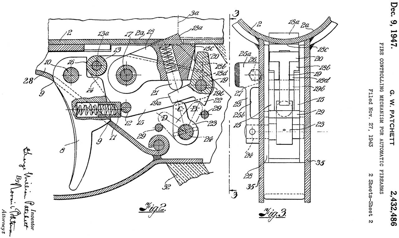 2432486 Fire controlling mechanism for automatic firearms, William Patchett George, Filed: Aug 17, 1942 Pub: Dec 9, 1947, 89/142, 298/22.0AE, 124/37 -