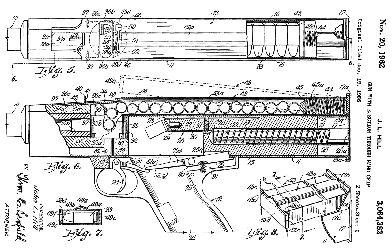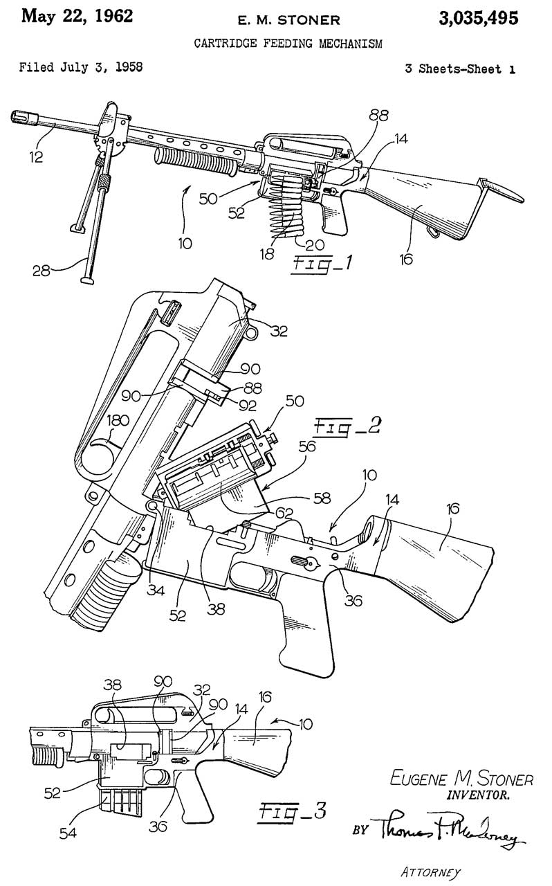 3035495 Cartridge feeding mechanism, Eugene M Stoner, Fairchild Engine and Airplane Corp (Wiki: ArmaLite), App: 1958-07-03, Pub: 1962-05-22, - either magazine or belt fed.