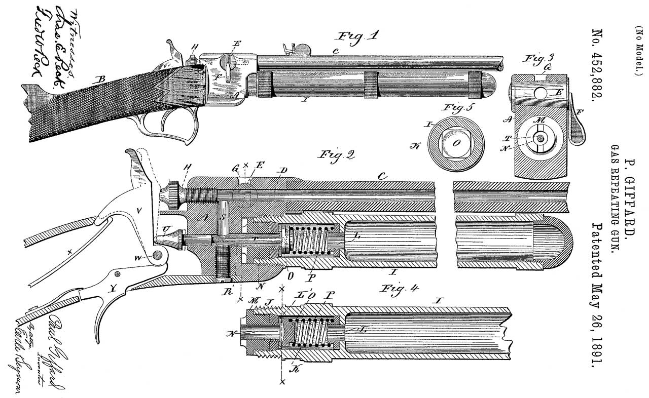 452882 Gas Repeating Gun, Paul Giffard, 1891-05-06, - magazine holds enough gas for many shots