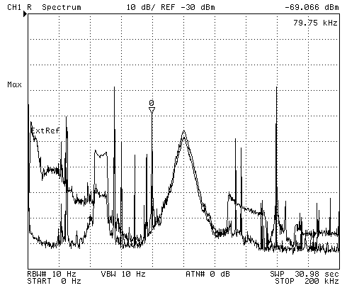 This is two plots overlaid. One is using the McKay Dymec DA-100 active whip antenna and the other the AMRAD active whip antenna.The plot with the lower noise floor at 0 kHz is the DA-100. The flat top peak on the DA-100 plot about 2 1/4 squares from the left is caused by this antenna being pretty much directly over my radio room by about 20 feet. Whereas the AMRAD antenna was placed on the ground about 90 feet away from the radio room.