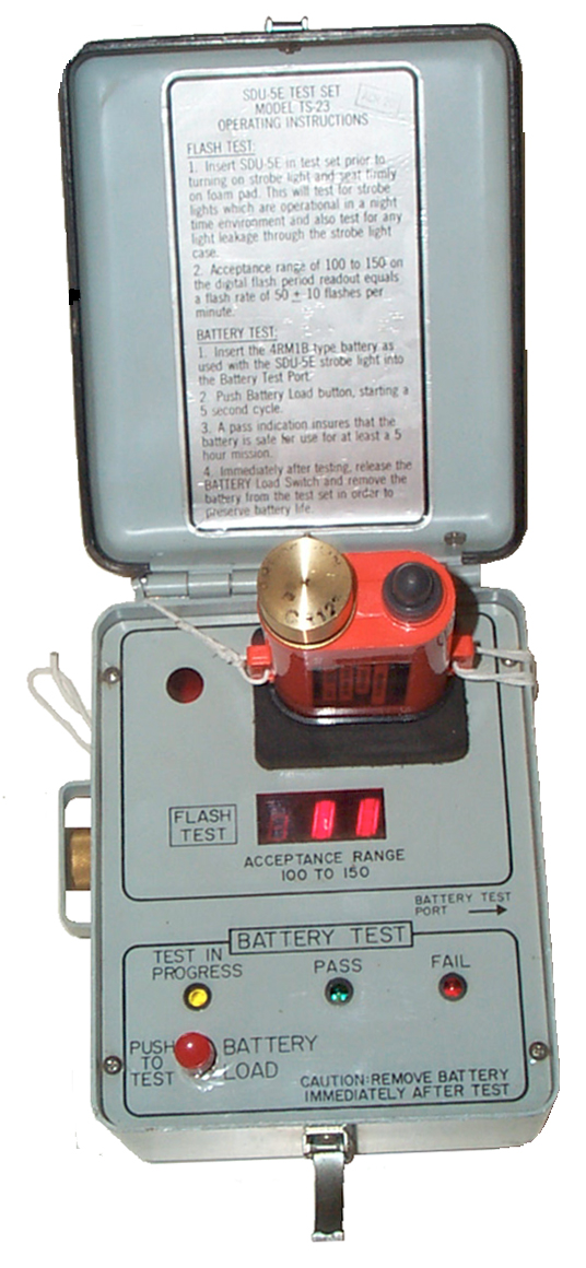 This test set made by ACR Electronics tests the frequency of the flashes of the SDU-5/E Light Marker, Distress and as a seperate test checks the BA-1574/U Mercury battery.In order to take the photo with the SDU-5/E installed and working the lanyard was used to hold the strobe down otherwise the trap door over the light chamber would lift the SDU-5/E out. The flash test appears to measure the time between flashes with a specified display number between 100 and 150 being the acceptance range.