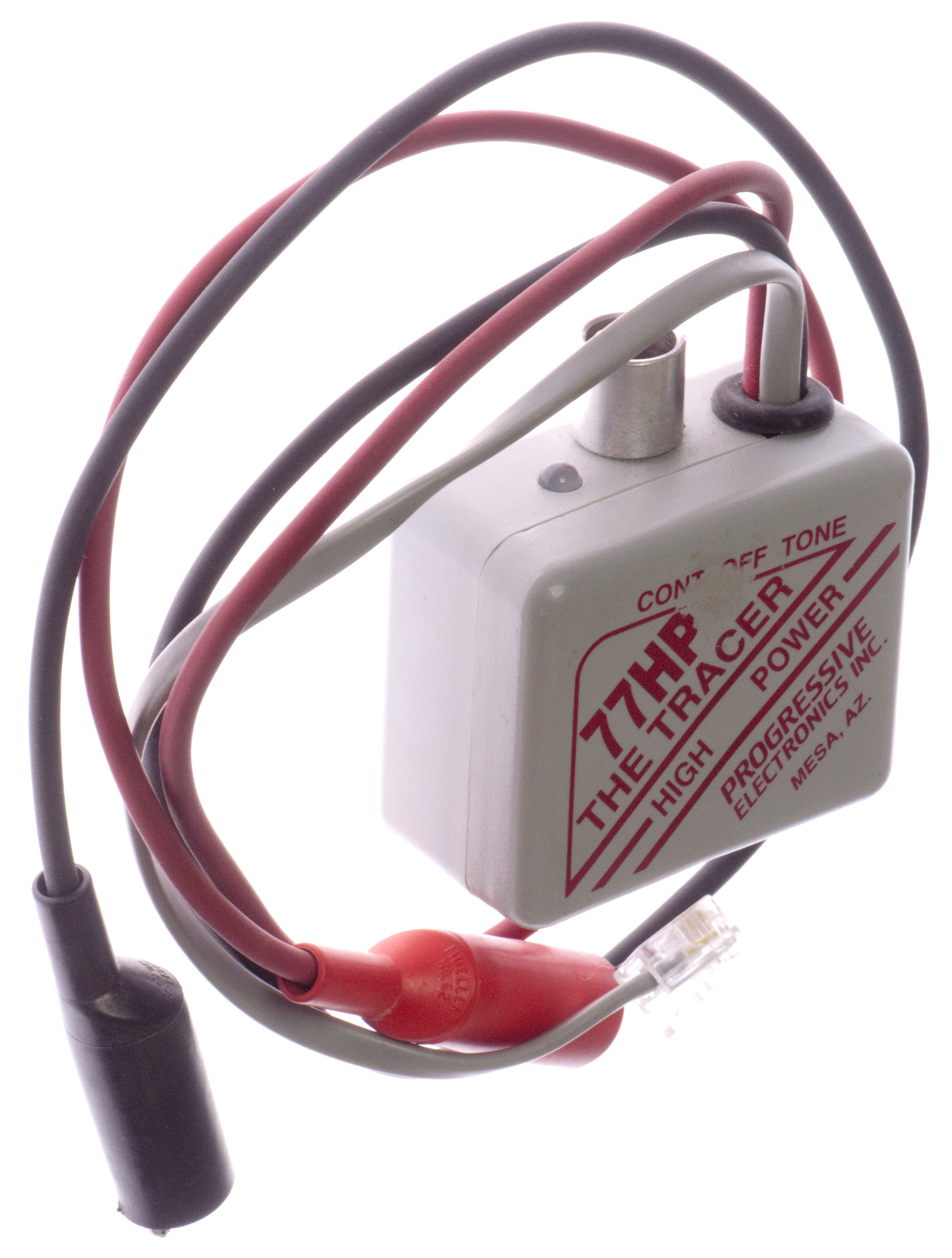 This inductive tone probe has a self contained speaker and volume control. Push to turn on, release to turn off button.