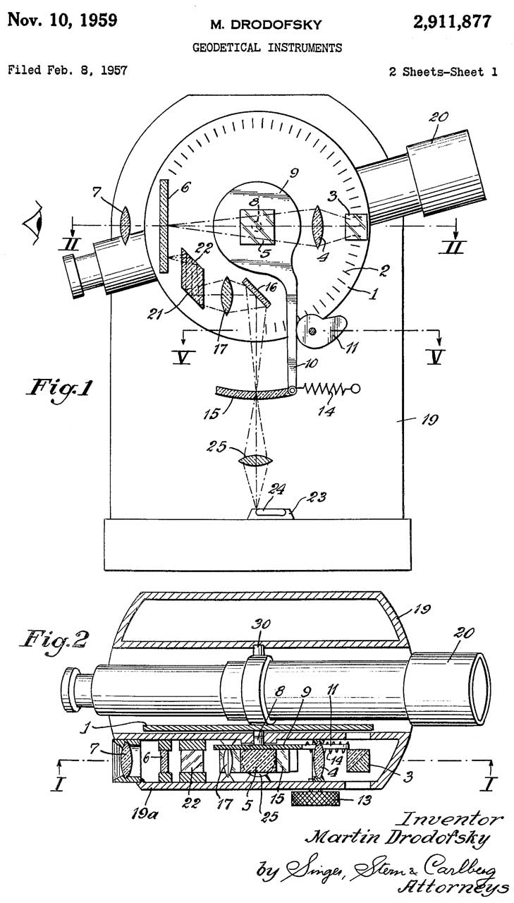1494565Theodolite, spectroscope, and the like, May 20, 1924, 356/147 - "It is the object of the present invention to enable the observation of the cross webs and the reading of the micrometer to be taken without removing the eye from the eyepiece." Note: "web" means spider web, modern term cross hairs or reticule.