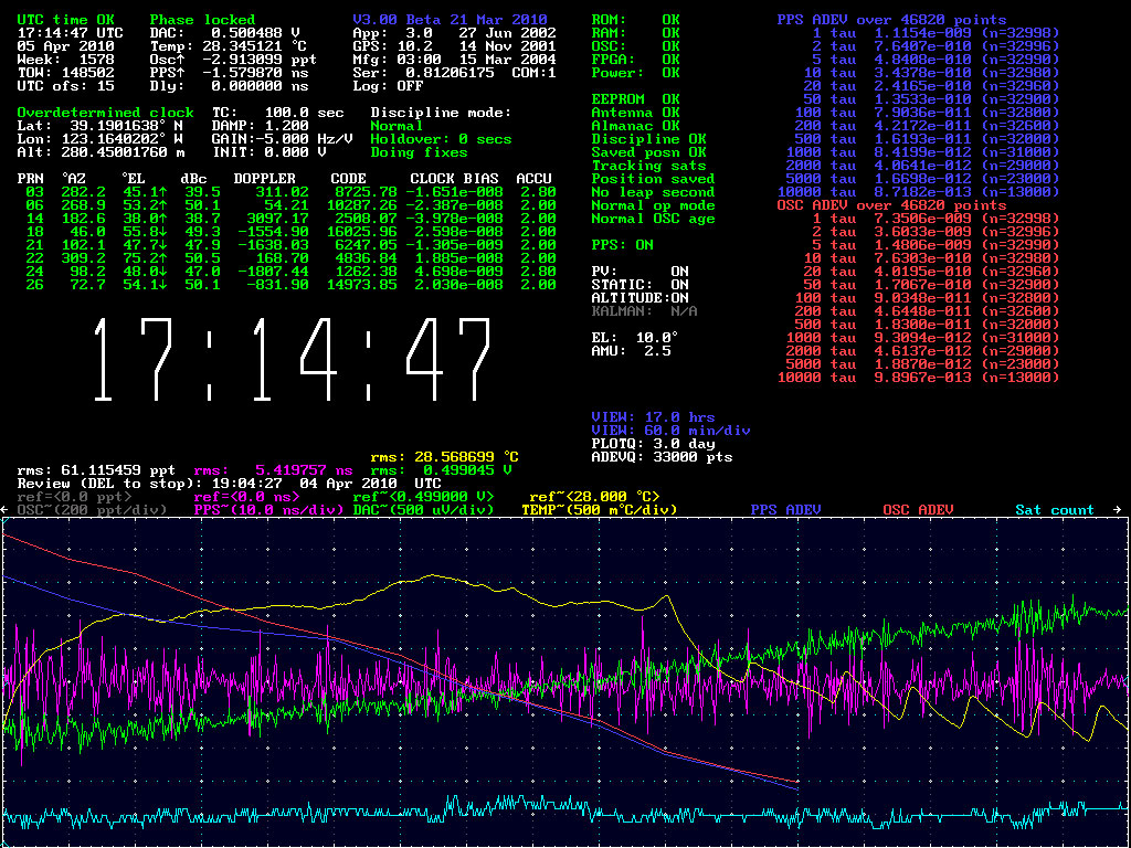 set. The second line shows: No Message if it's not connected to the serial port of the Thunderbolt, or alternating: MODE: Normal ACT: Phase Lock RX: Overdet Clk GPS: Doing Fixes TEMP: 32.45 DAC V: 0.4874 |
