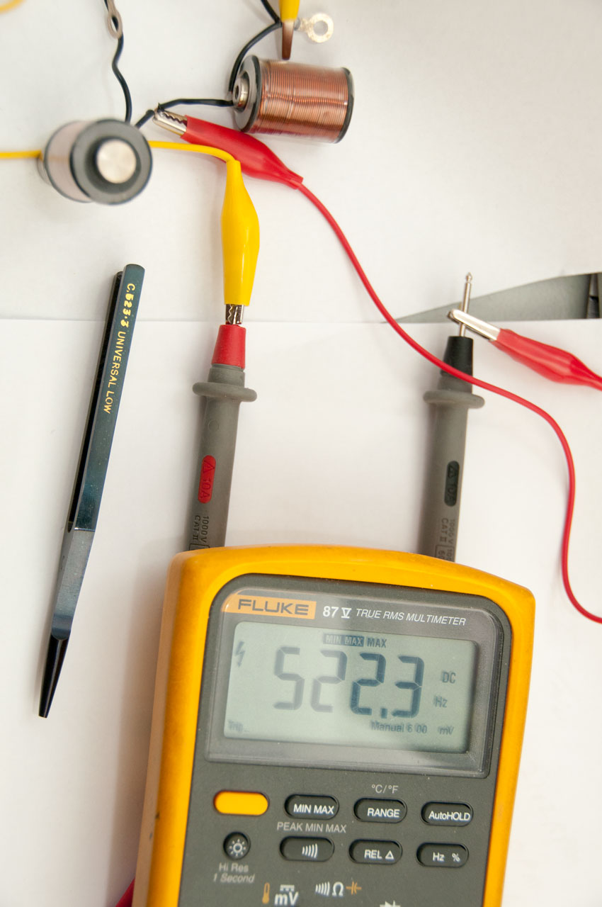 I just happened to have some Tattoo Machine Coils on the desk as well as some magnets stuck to the legs. By combining them with a DMM and can measure the frequency of a tuning fork that has some ferrous metal. The procedure is to place a permanent magnet on the core of the coil this way any movement of a ferrous object near the coil will generate AC electricity. Now for the Fluke 87 IV DMM: