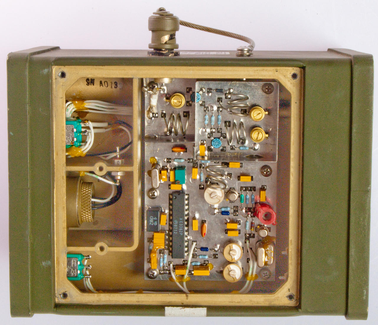It's a receiver that's powered by a BA-5590/U battery (and because of the CAUTION label I'd say specifically the BA-5590/U when it was made rather than a rechargeable battery). There's provision to power from either the battery or an external power source (Voltage TBD). There's also a choice of "A" or "B" receive frequencies (values TBD). The output connector is an MS3114 E12-10P (A, C & D: ground, B: output, other pins not used.