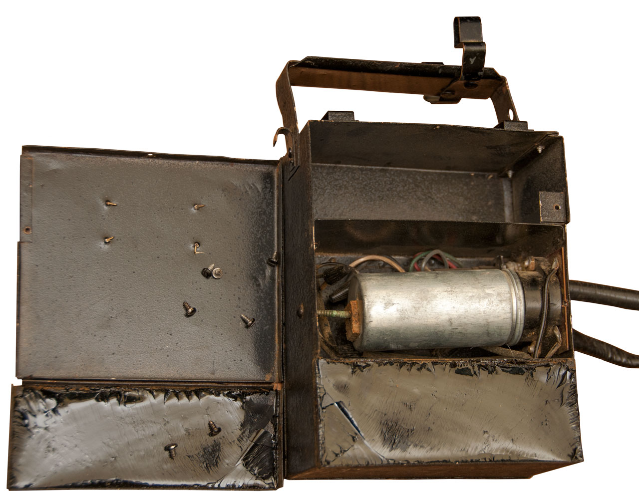Probably intended for portable use like prospecting. Runs from a ___ VDC battery. Vibrator (Wiki) power supply.