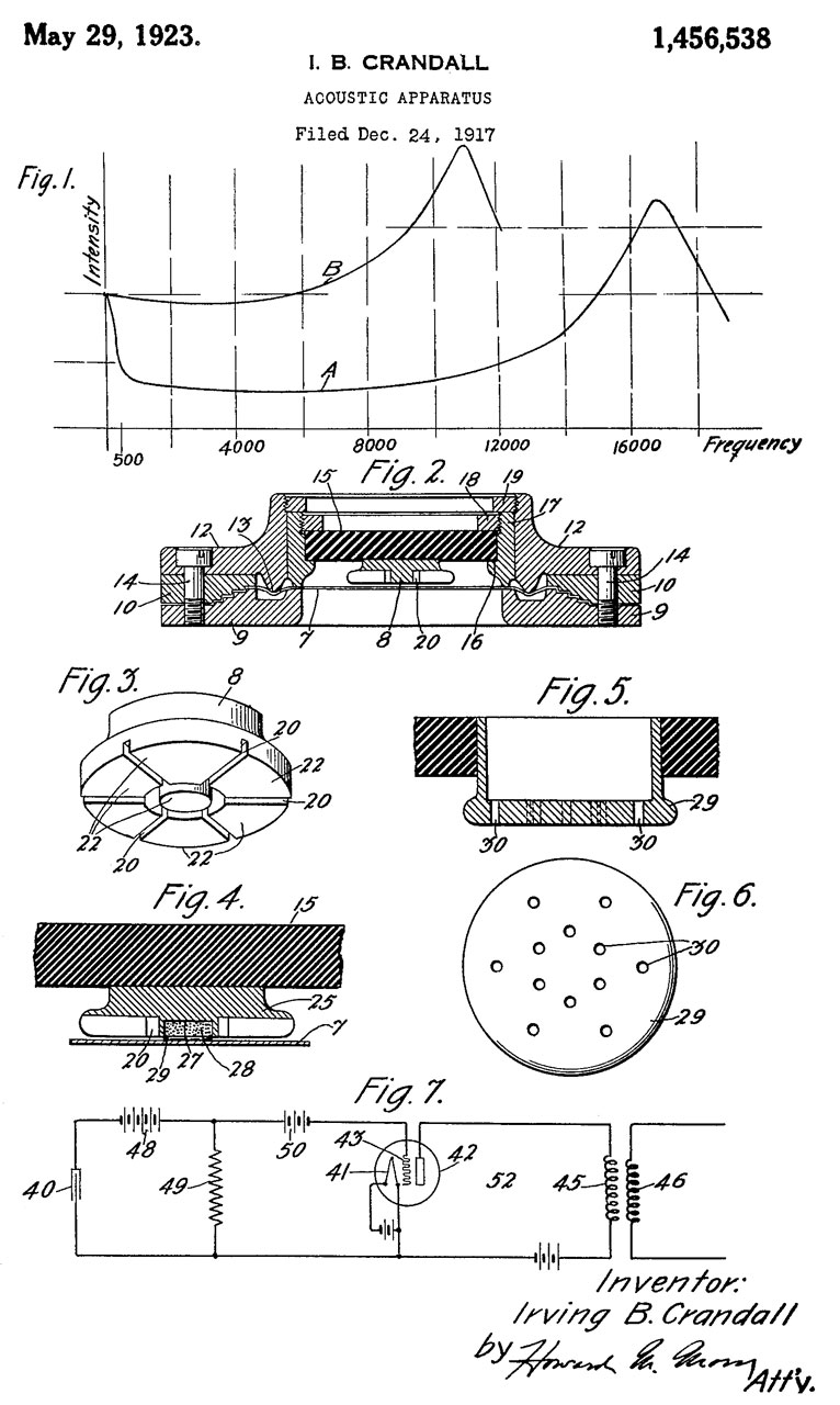 1456538 Acoustic apparatus,I.B. Crandall, Western Electric, Filed: Dec. 24, 1917, Pub: May 29, 1923