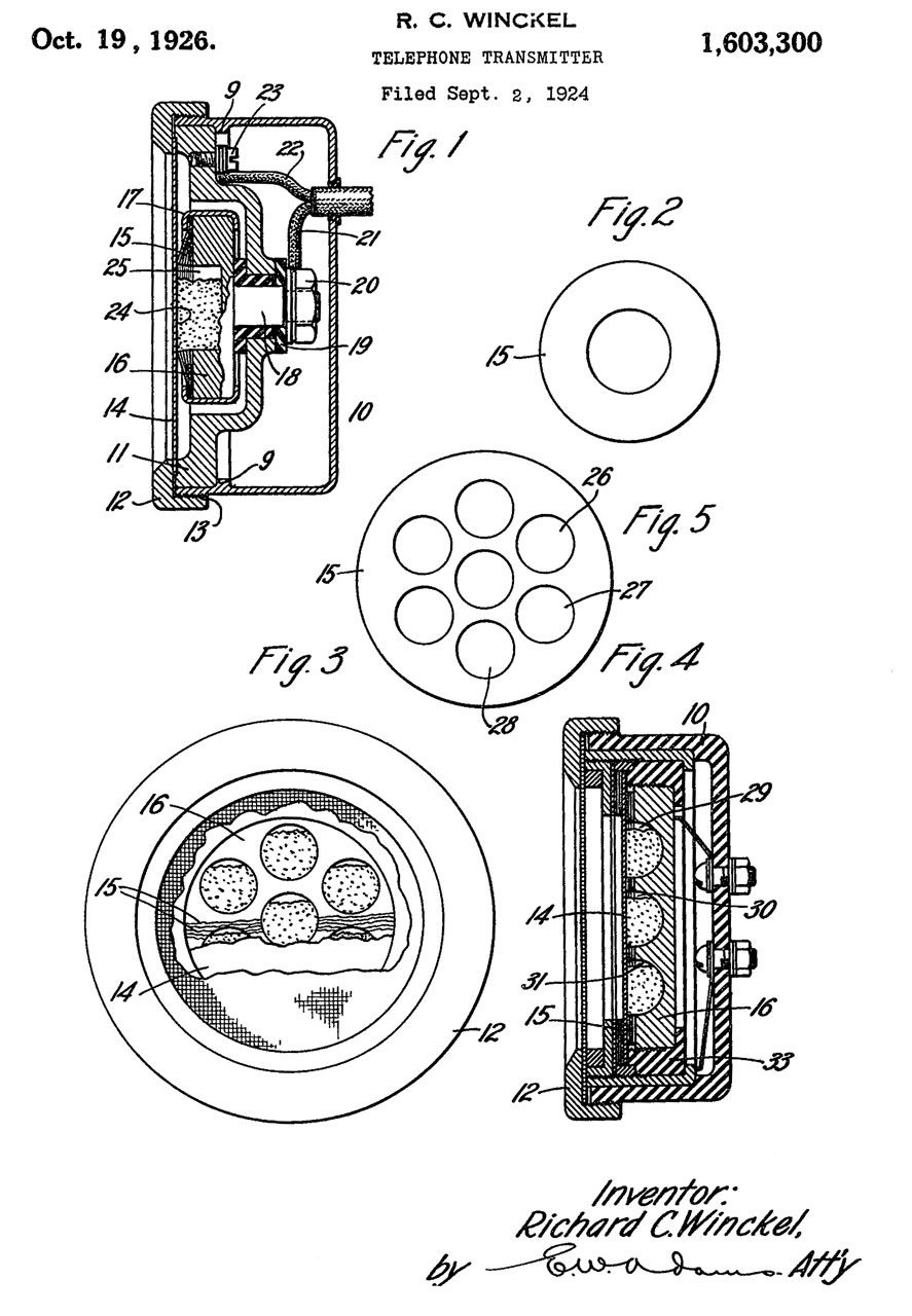 1603300 Telephone transmitter, Richard C Winckel, Western Electric, Filed: Sep. 2, 1924, Pub: Oct. 19, 1926