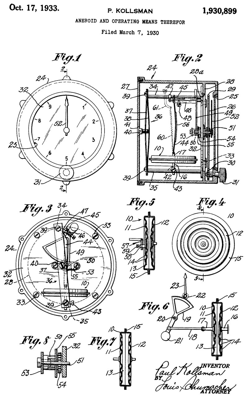1980732 Compensating device in measuring apparatus, Paulin Josua Gabriel, 1934-11-13, - "...to eliminate measuring errors in sensitive apparatus, such as aneroid barometers, due to elastic inertia, or hysteresis in the movable system."