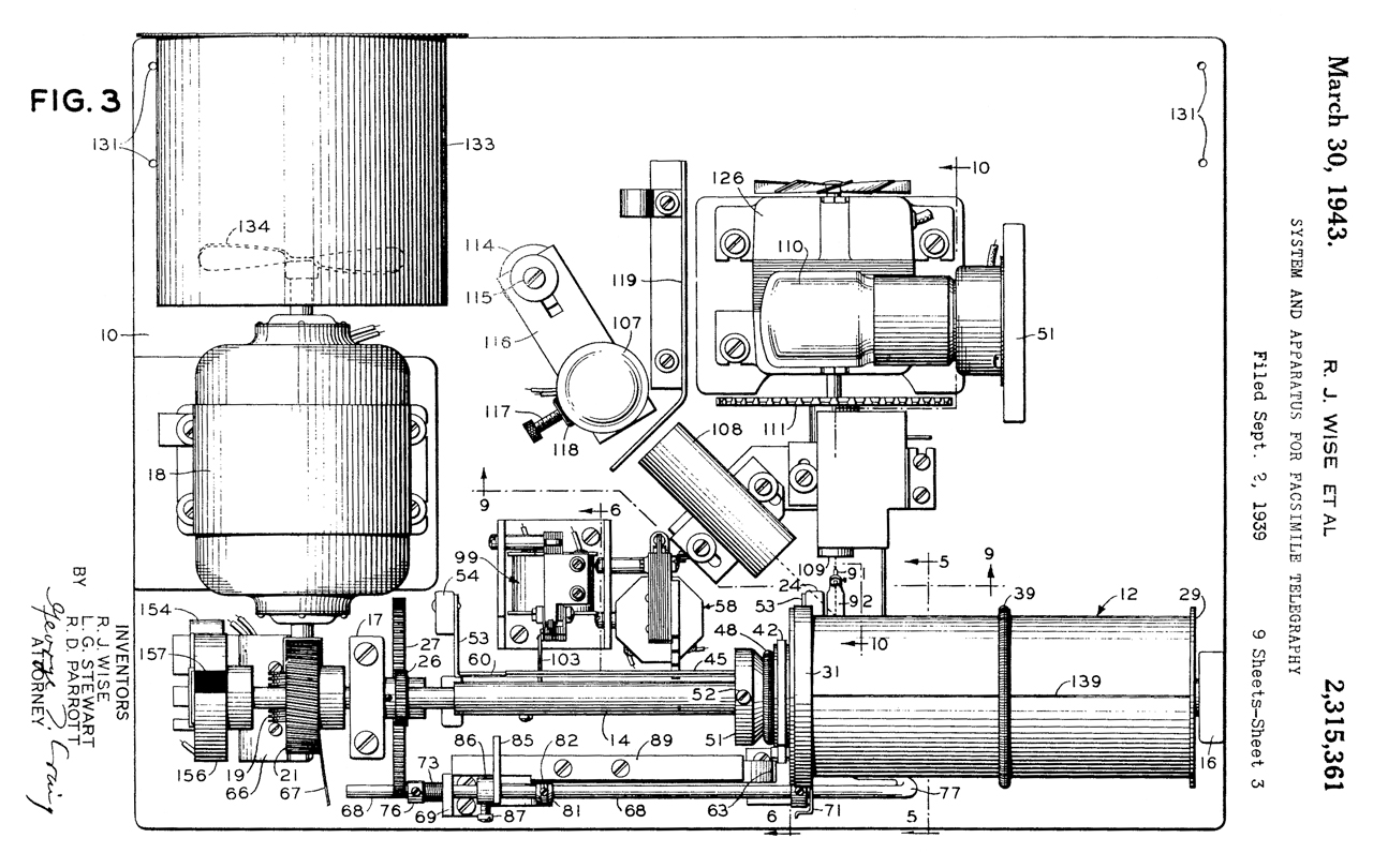 2315361 System and apparatus for facsimile telegraphy, Raleigh J Wise, Louis G Stewart, Robert D Parrott, Western Union, App: 1939-09-02, W.W.II, Pub: 1943-03-30, -