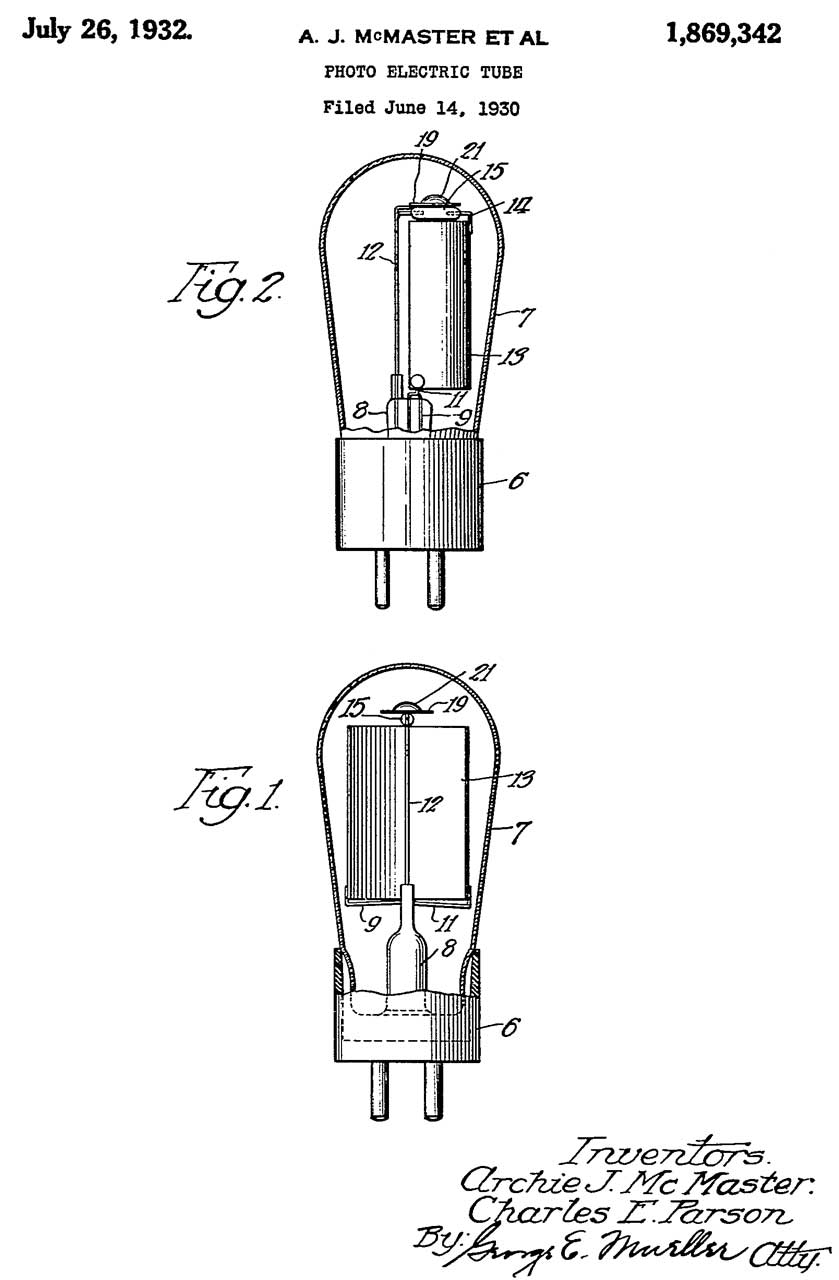 1869342 Photo-electric tube, Archie J Mcmaster, Charles E Parson, GM Labs, 1932-07-26, 313/523; 252/181.7; 427/77; 427/106; 427/108; 427/123; 428/929; 428/935; 428/937; 445/11; 445/12; 313/346R -