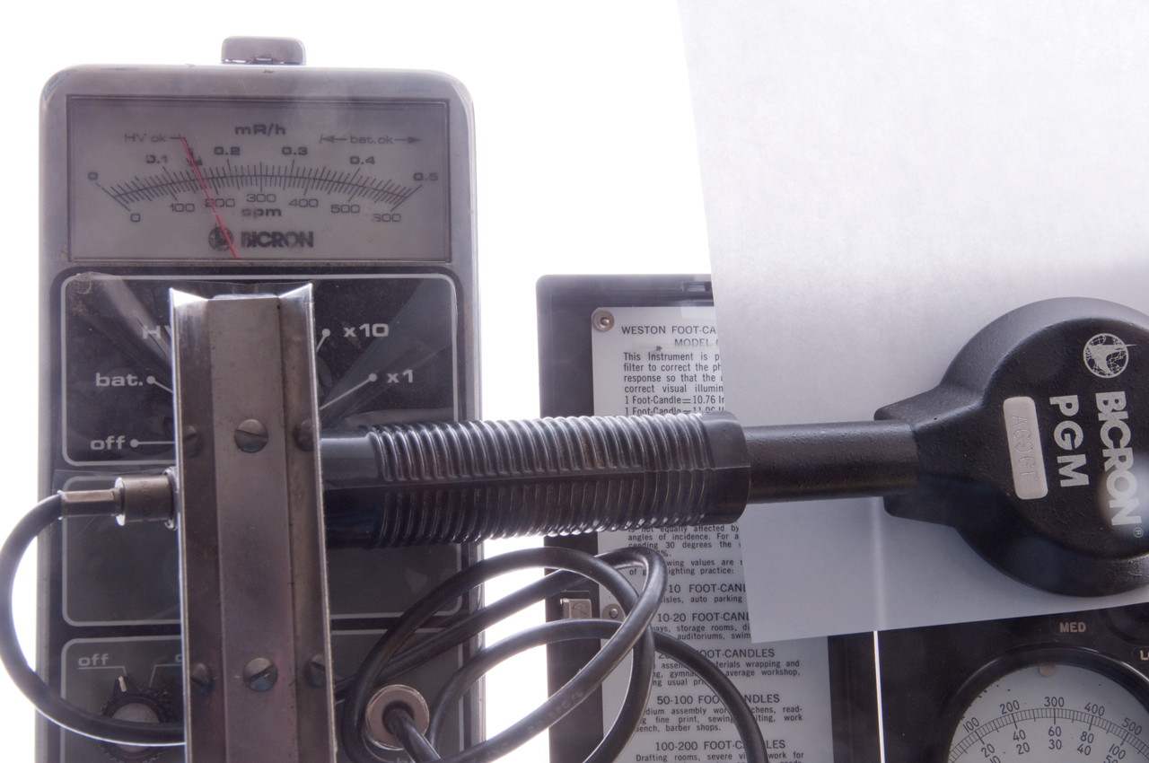 The Geiger counter reading is only 4,000 counts per minute for this meter, much less than for the 614 above. Probably because the white diffuser blocks the radiation.