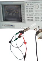 The Red micro grabber can easily be moved from the active crystal lead to the other lead thus providing a through connection without moving much of the setup. Above 5 MHz the effect of the lead wires starts to show up and at 50 MHz this setup is not very good. For working with higher frequency crystals some sort of test fixture to hold the crystal and ground the case would be needed.