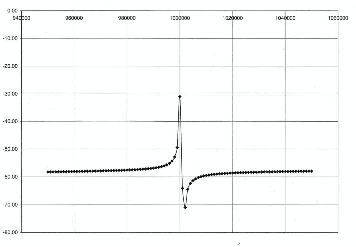 Plotted results on Excel spread sheet - Note that on both the network analyzer and on the Excel plots that the peak is often missed because of the actual points being used. On this plot the Fr peak looks like it's at -32 dB, but it's really at -11 dB and will show up on the Excel plot if the actual value of Fr is inserted into the data set.