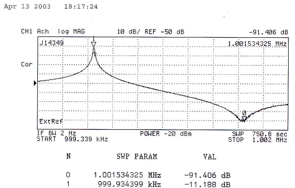 This web page is the result of finding that the HP 4395A can measure crystals in the Network Analyzer mode where the crystal is in series with the center conductor of a coax line. The marker can be read to a milli Hertz even through the RBW is set to 2 Hz, not sure of the significance of those extra digits if any, but the plots look very smooth.