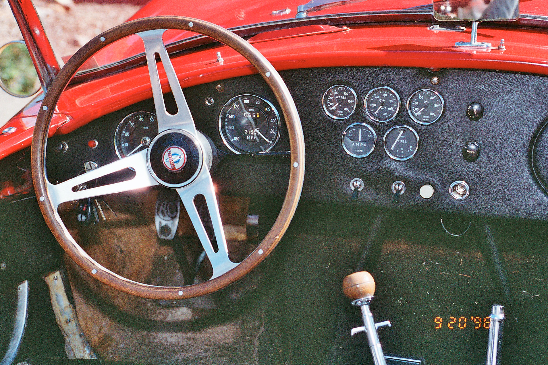 The car has near 50% - 50% weight balance. To accomplish this the engine is set back and therefore the transmission is set back. The gear shift lever bends forward so that it can be used. I used t park this car on the street and on a number of occasions the shift knob would be stolen. I just replaced it with a ford pickup truck knob knowing that it would be taken again. The new owner proudly showing off his new "Cobra shift knob".