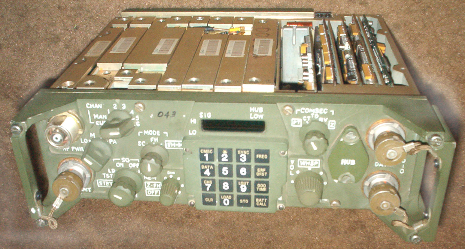 Frequency hopping radio covering 30 to 87.975 MHz in 2,320 channels. uses an external KY-57 for Transmission Encryption. Can use either the MX-18290 or the MX-10579 to load the hop sets (Select 1 to 13) and the Transmission Security Key (TSK) (T1 to T3). The hop sets define which frequencies will be used and the TSK supplies the key for the pseudo random generator that chooses which frequency to transmit or receive. For voice security (COMSEC) an external KY-57 is needed which requires a different key loader.