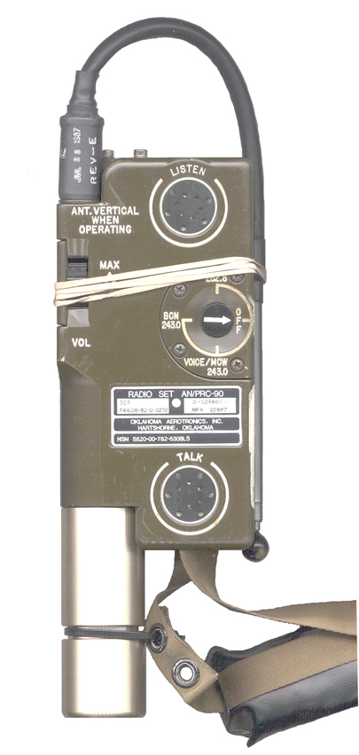 The pocket that can be sewn onto survival vest SRU-21 will hold the PRC-90 with the 90BAv2 battery adapter attached. My pocket has contract number DLA-100-82C-C-0394 and manufacturer Camlet Corporation,Roch. NY. If the radio is installed into the vest antenna first then the battery adapter makes a nice handle to remove the radio.